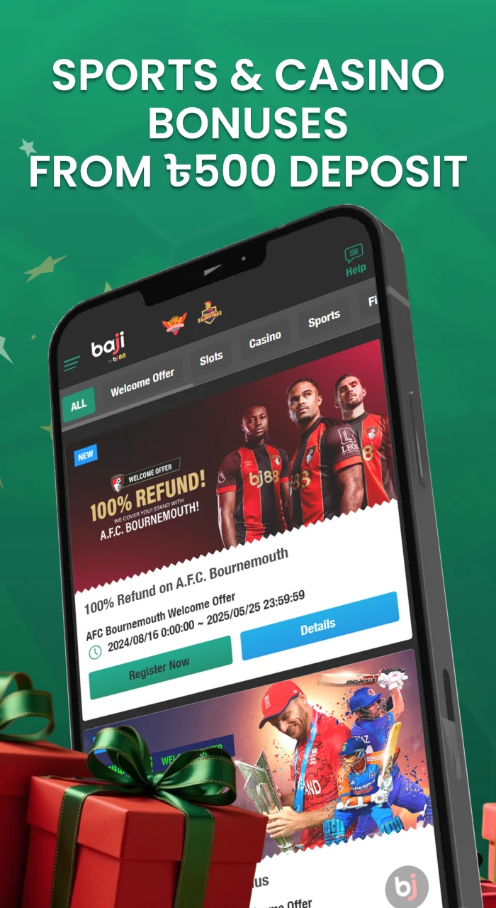 - Exclusive welcome bonuses: When you download Baji bet app and register through it, you can claim exclusive bonuses, including a welcome offer of up to 7,777 BDT for sports betting;